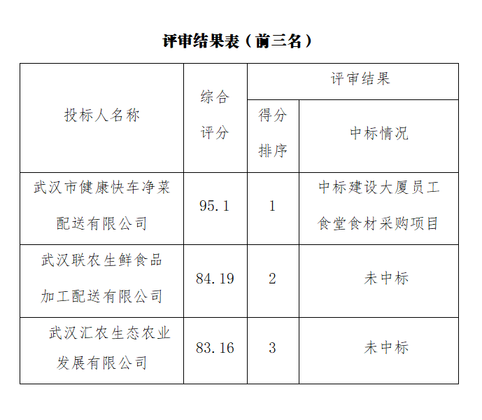 ? ? 經(jīng)評(píng)審,綜合評(píng)分排名第一為武漢市健康快車(chē)凈菜配送有限公司,綜合評(píng)分為95.1分,中標(biāo)武漢市政工程設(shè)計(jì)研究院有限責(zé)任公司建設(shè)大廈員工食堂食材采購(gòu)項(xiàng)目。