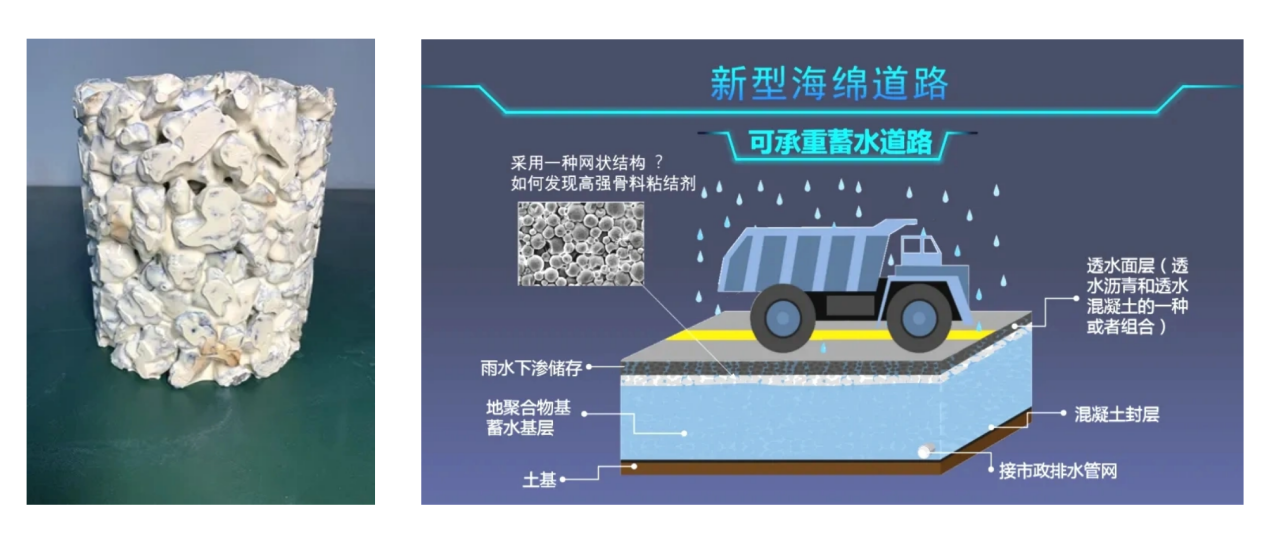 本次獲獎(jiǎng)的《海綿城市可承重蓄水道路材料研發(fā)》科研項(xiàng)目打破了傳統(tǒng)的要求道路基層嚴(yán)格防水的固有思維局限,首次且極具創(chuàng)造性地提出了利用高空隙率的道路基層作為蓄水空間的可承重蓄水道路的新理念。依照這種新的理念,項(xiàng)目團(tuán)隊(duì)制定了嶄新的研究思路并成功開(kāi)發(fā)出了一種具有高強(qiáng)度、高粘結(jié)特性的新型地聚合物凝膠材料,利用該凝膠材料包覆開(kāi)級(jí)配骨料表面能夠?qū)⒋止橇侠喂痰卣辰Y(jié)在一起,可形成具備高強(qiáng)度和高空隙率的蜂窩狀空間結(jié)構(gòu)凝聚體路基材料,從而能夠在保證路基結(jié)構(gòu)整體強(qiáng)度的同時(shí),實(shí)現(xiàn)高效的道路基層蓄水功能,有利于緩解城市內(nèi)澇,達(dá)到海綿城市可承重蓄水道路建設(shè)的要求,同時(shí)也為大幅提升城市地下空間有效利用率提供了新的可能性。在該項(xiàng)目開(kāi)展成果評(píng)價(jià)時(shí),評(píng)價(jià)專(zhuān)家委員會(huì)也一致認(rèn)為項(xiàng)目研究成果達(dá)到了國(guó)內(nèi)領(lǐng)先水平。