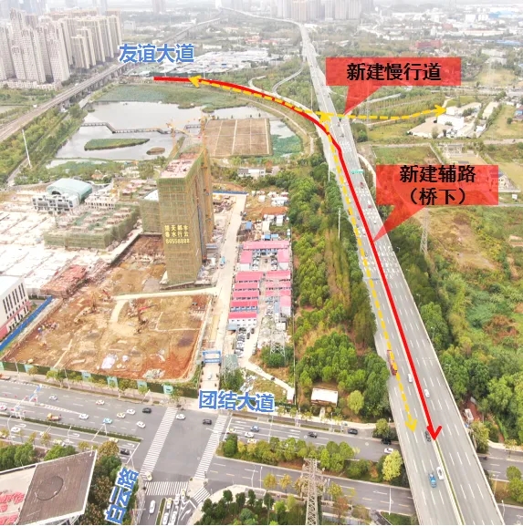 為解決周邊慢行系統(tǒng)連接缺失問(wèn)題,本項(xiàng)目新建慢行道連接友誼大道立交東西兩側(cè)及友誼大道至團(tuán)結(jié)大道,并與楊春湖公園綠道連接成環(huán),在立交范圍內(nèi)構(gòu)建一個(gè)更加安全、便捷、舒適的慢行交通系統(tǒng)。