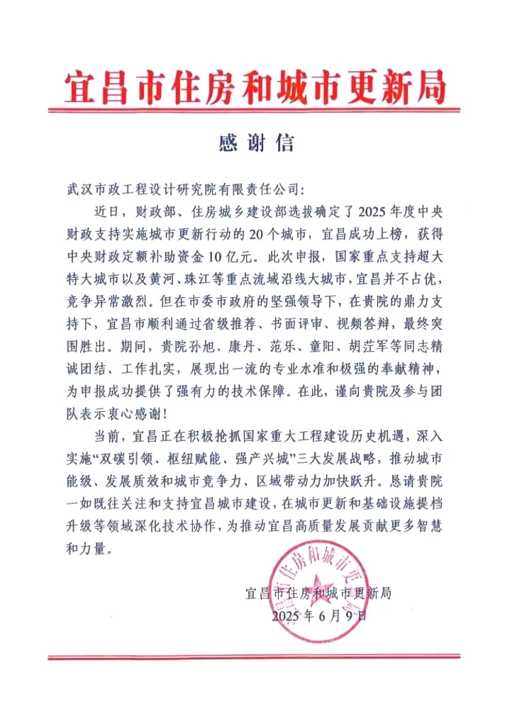 2025年6月4日,國(guó)家財(cái)政部經(jīng)濟(jì)建設(shè)司與住房城鄉(xiāng)建設(shè)部城市建設(shè)司聯(lián)合發(fā)布《2025年度中央財(cái)政支持實(shí)施城市更新行動(dòng)評(píng)選結(jié)果公示》,湖北省宜昌市成功入圍。武漢市政院作為唯一技術(shù)支持單位助力宜昌成功入選國(guó)家支持城市名單,充分彰顯了公司作為城鄉(xiāng)建設(shè)運(yùn)營(yíng)全過(guò)程咨詢智庫(kù)的卓越技術(shù)實(shí)力。