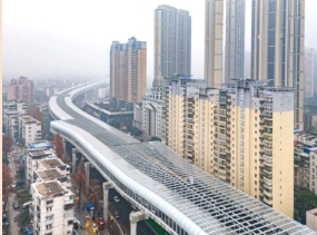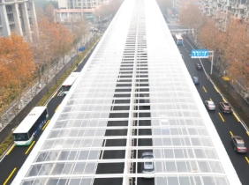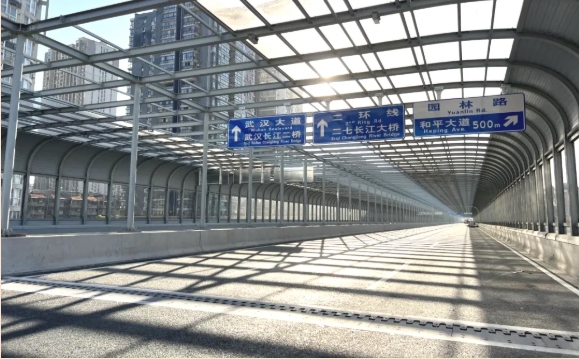 ? ? 項(xiàng)目設(shè)計(jì)團(tuán)隊(duì)始終秉持 “輕量化、智能化、綠色化” 理念,多項(xiàng)技術(shù)應(yīng)用填補(bǔ)區(qū)域空白,樹(shù)立行業(yè)新標(biāo)桿。在鋪裝材料與工藝上,主線(xiàn)高架鋼箱梁橋面采用澆注式瀝青鋪裝,相比傳統(tǒng)方案減重16%,既降低橋梁結(jié)構(gòu)負(fù)荷、提升安全性,又縮短施工周期;鋼箱梁采用U肋全熔透智能焊接,大幅提高結(jié)構(gòu)疲勞壽命,積極推進(jìn)鋼箱梁U肋焊接工藝的發(fā)展。尤為引人注目的是,本項(xiàng)目集中展現(xiàn)了三大創(chuàng)新亮點(diǎn):它擁有全國(guó)最長(zhǎng)的連續(xù)全封閉聲屏障,是湖北省首例“光伏+市政”的融合實(shí)踐,更在武漢率先實(shí)現(xiàn)了聲屏障光伏發(fā)電的應(yīng)用,為綠色市政建設(shè)樹(shù)立了新的樣板。