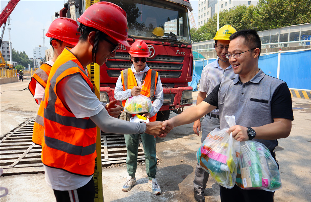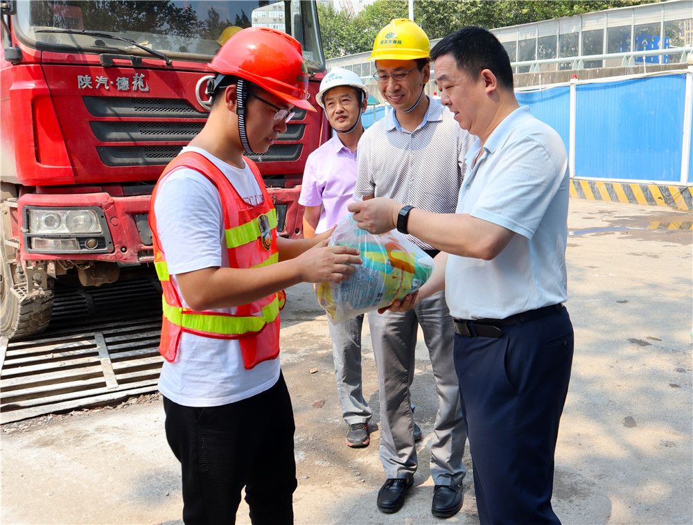 黃家湖綜合整治工程是對黃家湖周邊的路段、河流和景觀的綜合治理,提升城市景觀可視度,也是軍運會的重點項目。蔡輝一行到達這里已是正午時分,烈日正盛,但項目現(xiàn)場卻是一片熱火朝天的景象。員工們正在緊張有序地忙碌著。蔡輝一行為他們送上了防暑物資,提醒他們多飲水和佩戴好安全帽、注意安全,以優(yōu)質(zhì)的項目質(zhì)量迎接軍運會的順利召開。