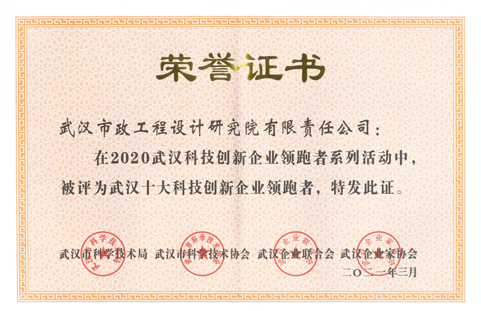 2021年4月15日,武漢創(chuàng)新與創(chuàng)業(yè)高峰論壇暨武漢科技創(chuàng)新企業(yè)領跑者系列活動頒獎盛典在武漢電視臺演播廳隆重舉行,武漢市政設計院榮膺“2020年度武漢十大科技創(chuàng)新企業(yè)領跑者”稱號,公司副總經理周俊作為嘉賓上臺領獎。