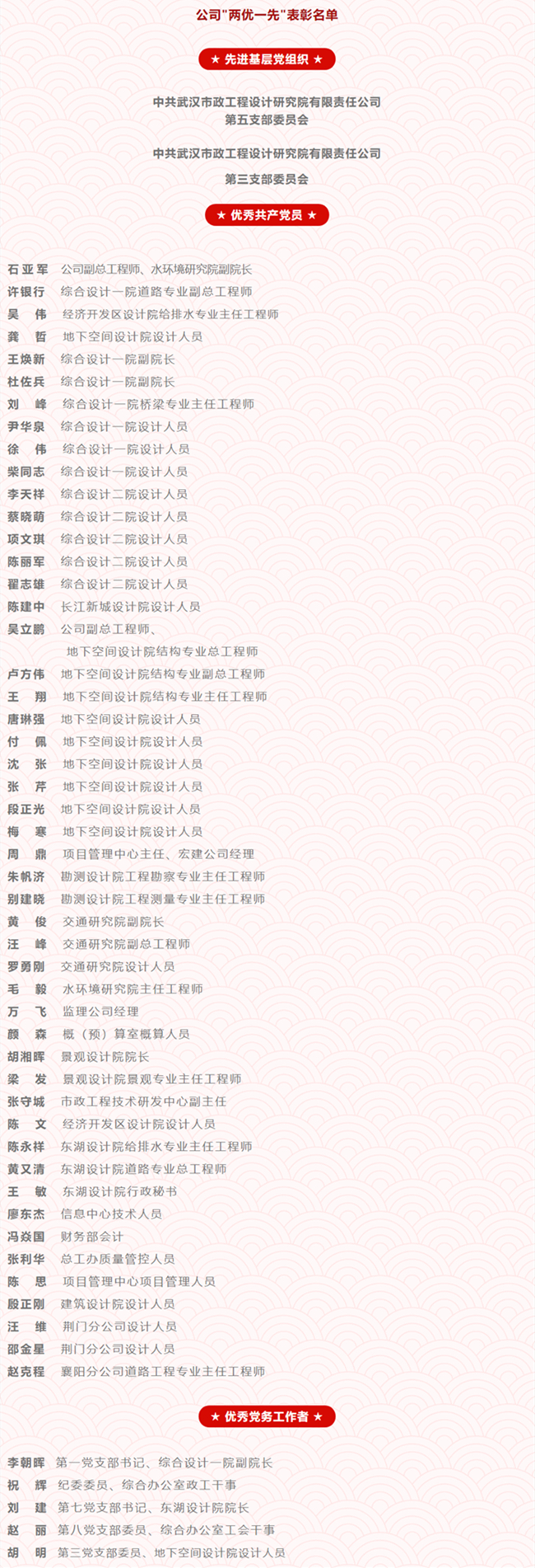 公司綜合設計一院道路專業(yè)副總工程師許銀行、經濟開發(fā)區(qū)設計院給排水專業(yè)主任工程師吳偉、地下空間設計院設計人員龔哲榮獲市城投集團公司“優(yōu)秀共產黨員”稱號;