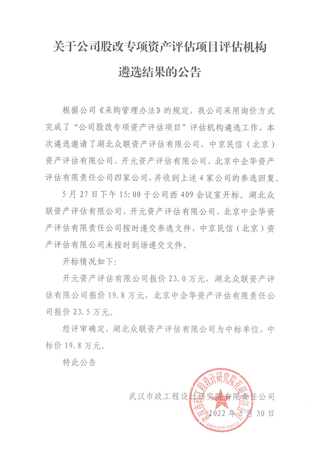 關(guān)于公司股改專(zhuān)項(xiàng)資產(chǎn)評(píng)估項(xiàng)目評(píng)估機(jī)構(gòu)遴選結(jié)果的公告