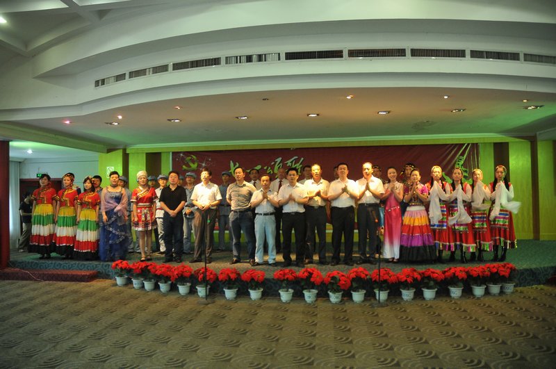 在莊嚴(yán)的《國(guó)際歌》中,總結(jié)表彰大會(huì)結(jié)束,一臺(tái)由公司黨員和入黨積極分子自編、自演的文藝演出正式開(kāi)始,《再唱山歌給黨聽(tīng)》、《長(zhǎng)征》、《情深誼長(zhǎng)》等精彩的歌舞節(jié)目贏得了觀眾的陣陣掌聲,演出現(xiàn)場(chǎng)洋溢著歡樂(lè)、喜慶的氣氛。演出最后,各位領(lǐng)導(dǎo)走到臺(tái)上,與全體演員和觀眾一起高唱《沒(méi)有共產(chǎn)黨就沒(méi)有新中國(guó)》,臺(tái)上臺(tái)下感情交匯,將現(xiàn)場(chǎng)氣氛推向高潮。