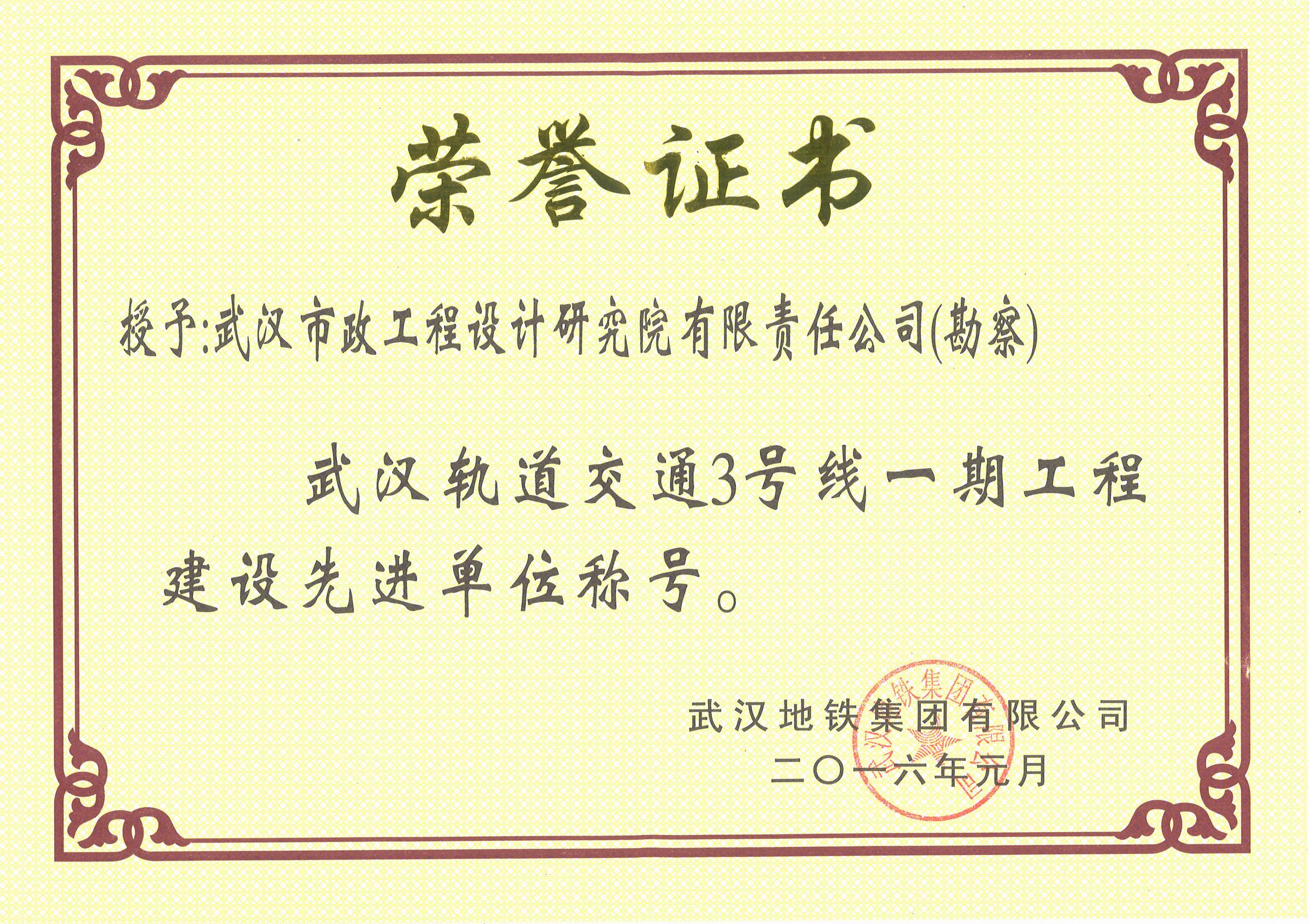 ??? 近日,武漢地鐵集團(tuán)有限公司頒發(fā)文件,表彰一批在武漢軌道交通三號(hào)線一期工程建設(shè)中表現(xiàn)優(yōu)異的先進(jìn)單位。公司由于參與并圓滿完成了三號(hào)線一期工程的勘察及部分站點(diǎn)和區(qū)間的設(shè)計(jì)工作,榮獲“先進(jìn)單位”榮譽(yù)稱號(hào)。