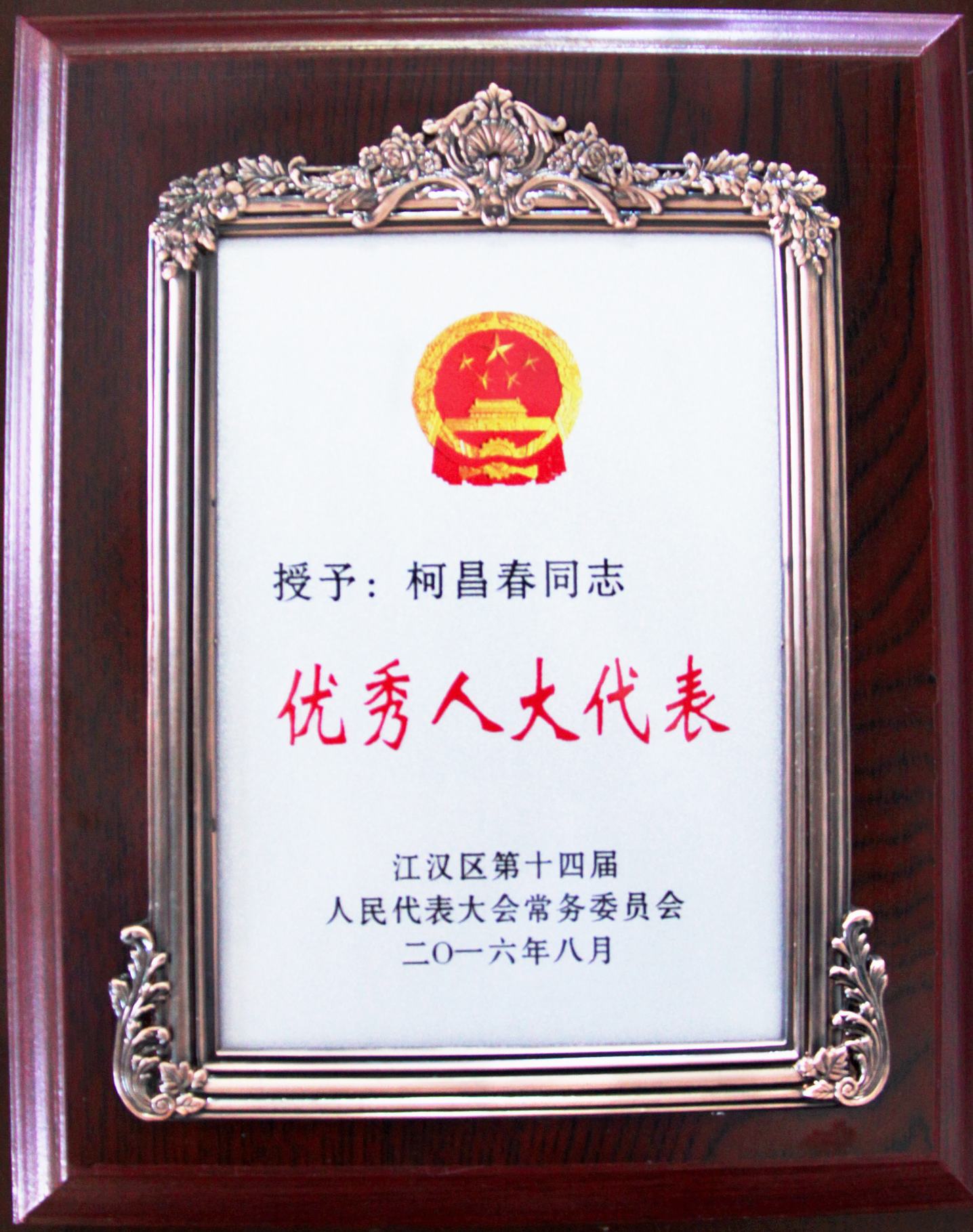 ??? 近日,一則喜報(bào)從江漢區(qū)人大傳來(lái),公司董事長(zhǎng)柯昌春同志在擔(dān)任江漢區(qū)人大代表期間積極為江漢區(qū)的建設(shè)和發(fā)展建言獻(xiàn)策,被江漢區(qū)人大授予“優(yōu)秀人大代表”榮譽(yù)稱號(hào)。