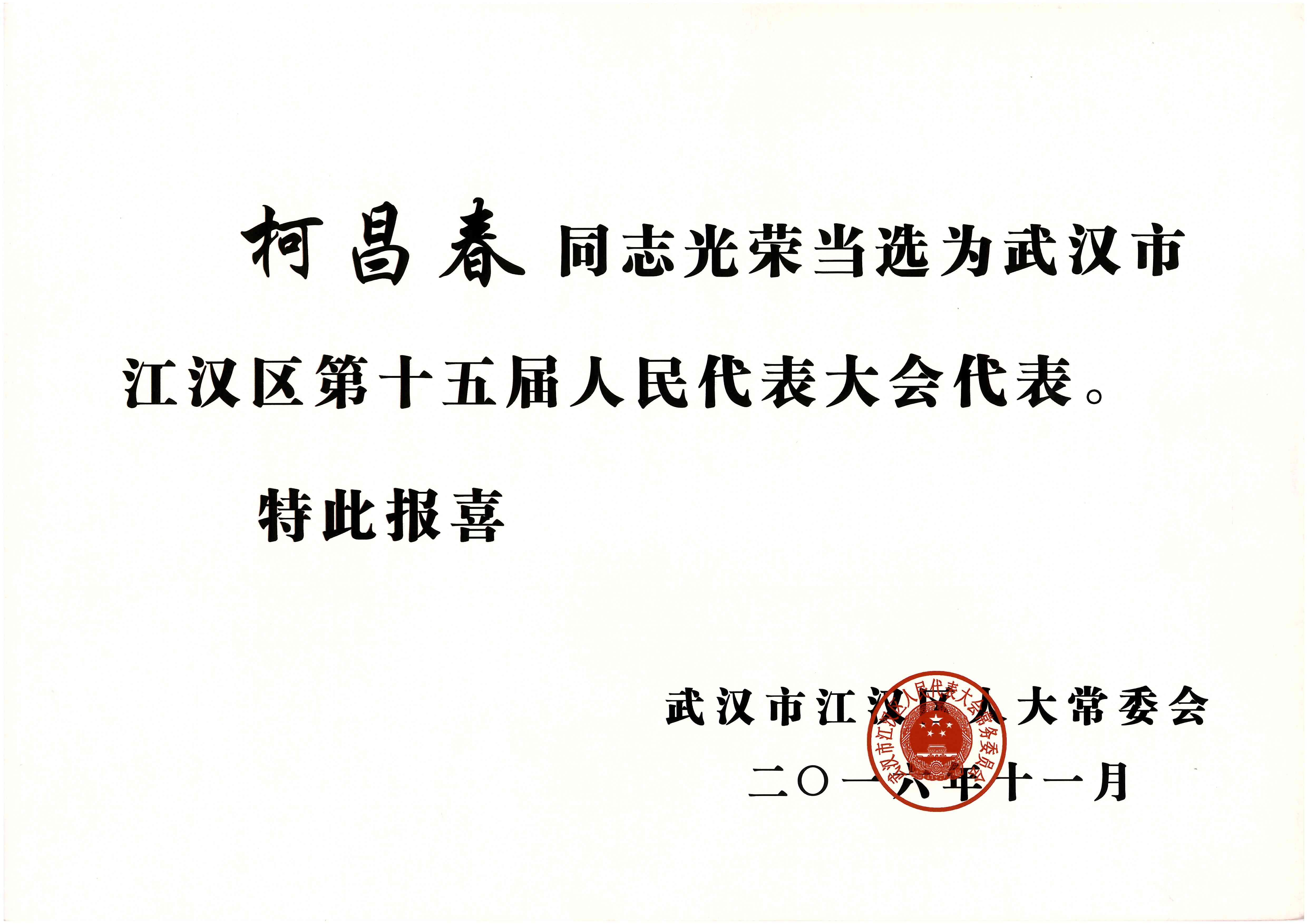 熱烈祝賀董事長柯昌春同志再次當(dāng)選為江漢區(qū)人大代表