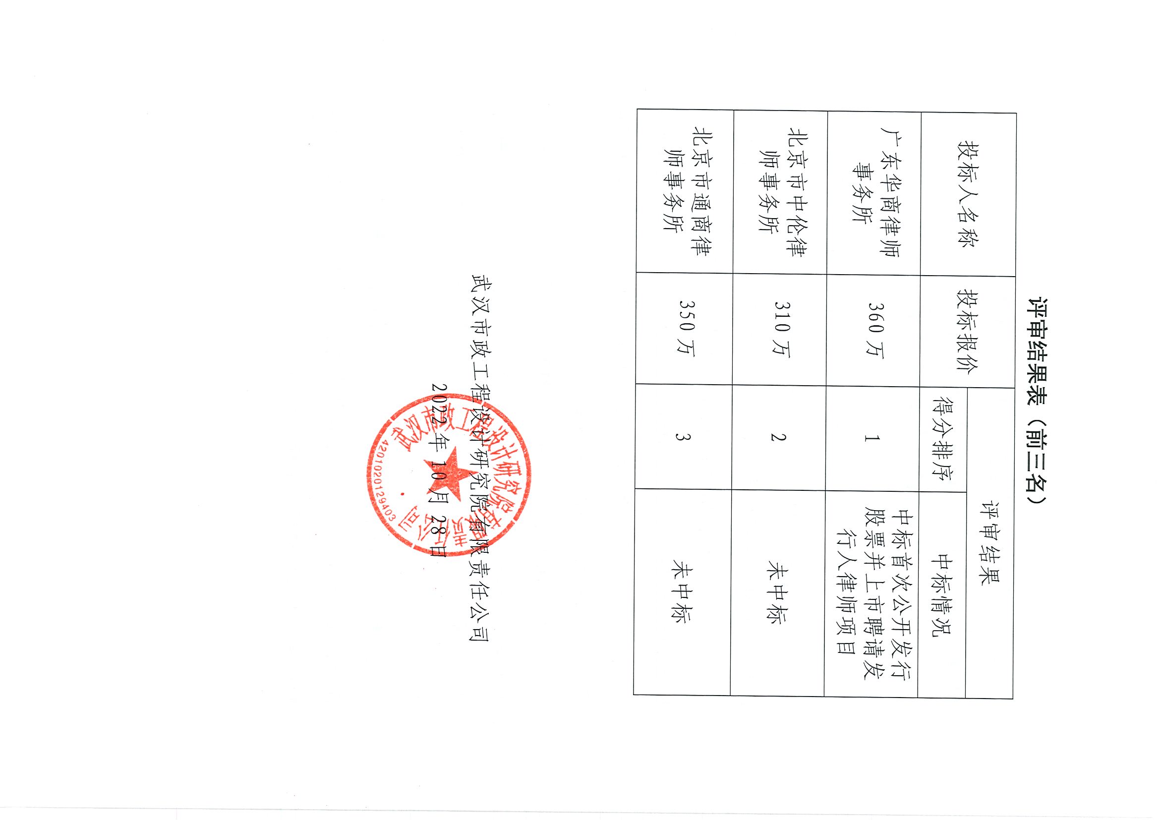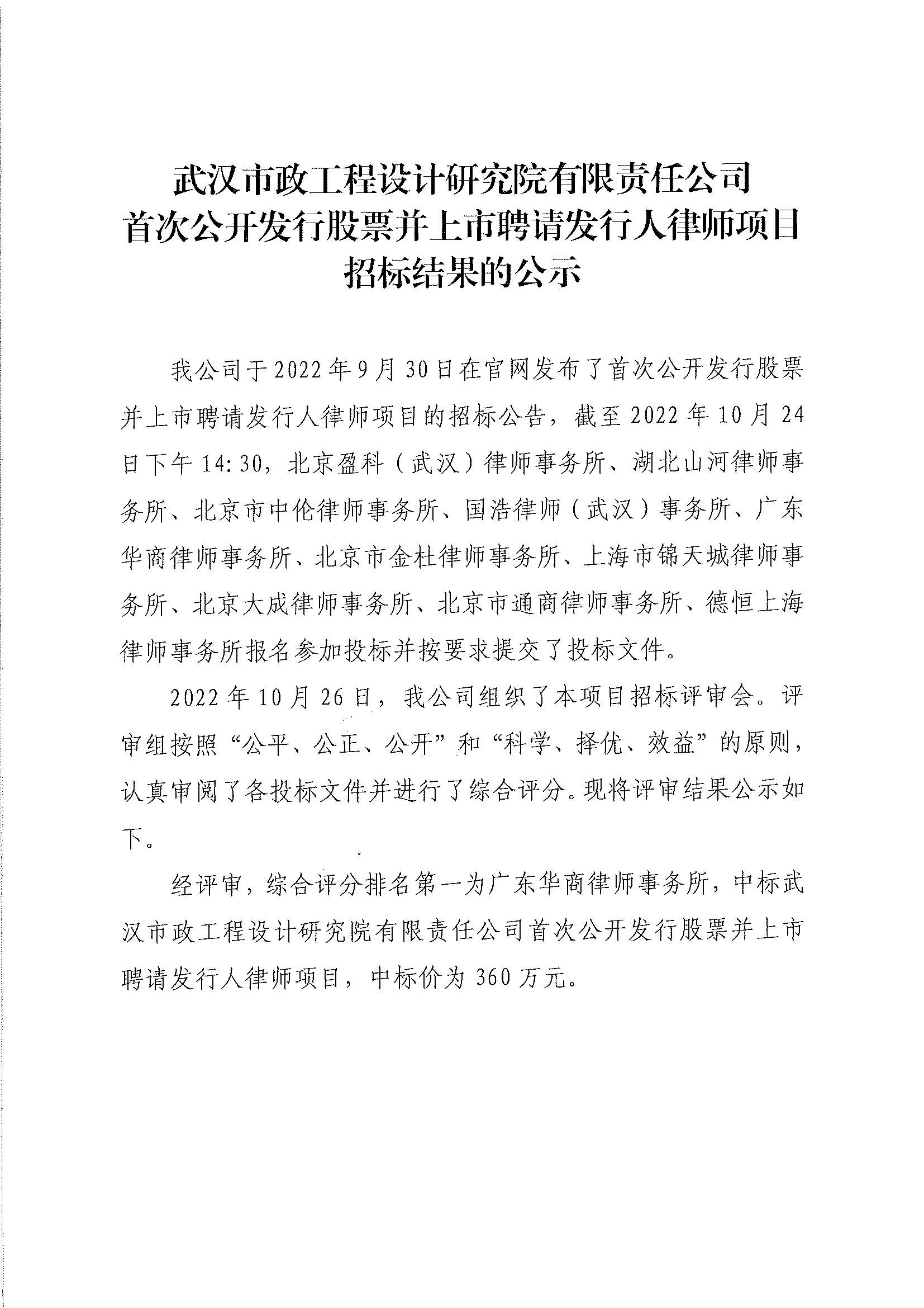 武漢市政工程設計研究院有限責任公司首次公開發(fā)行股票并上市聘請發(fā)行人律師項目招標結(jié)果的公示