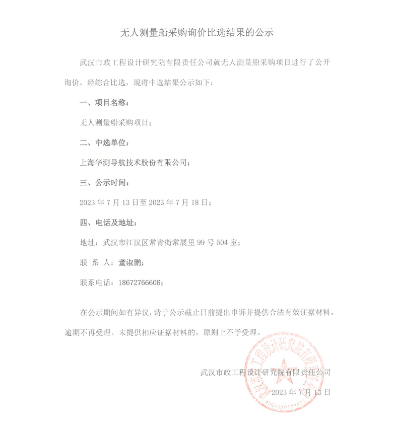 無人測(cè)量船采購(gòu)詢價(jià)比選結(jié)果的公示