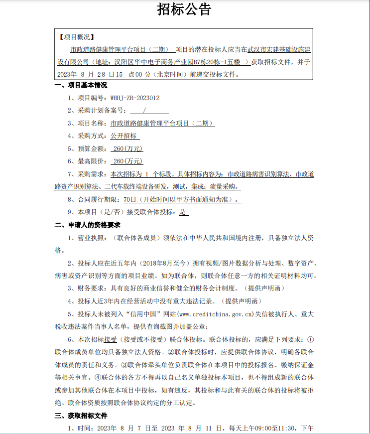 市政道路健康管理平臺項目(二期)招標(biāo)公告